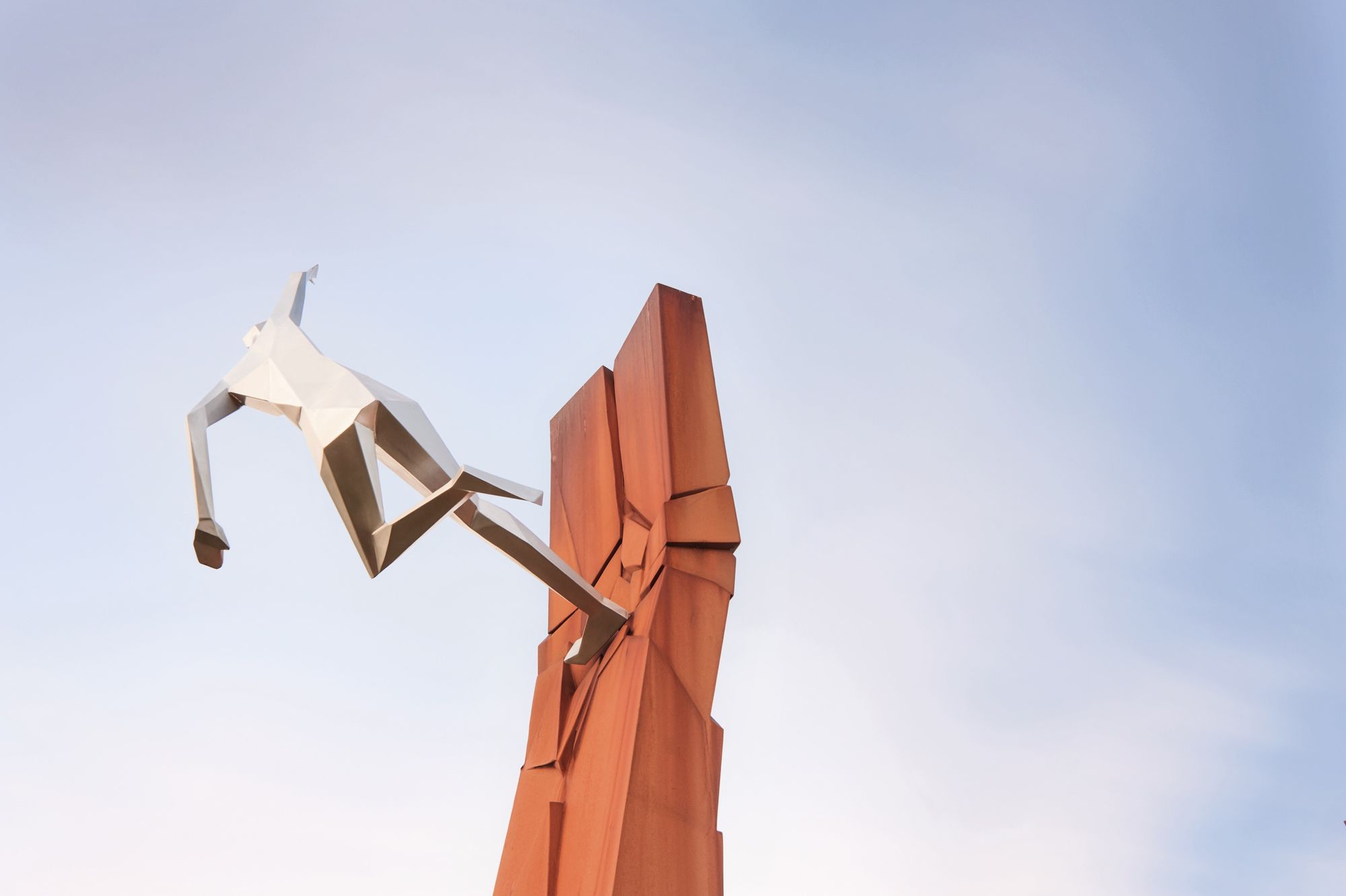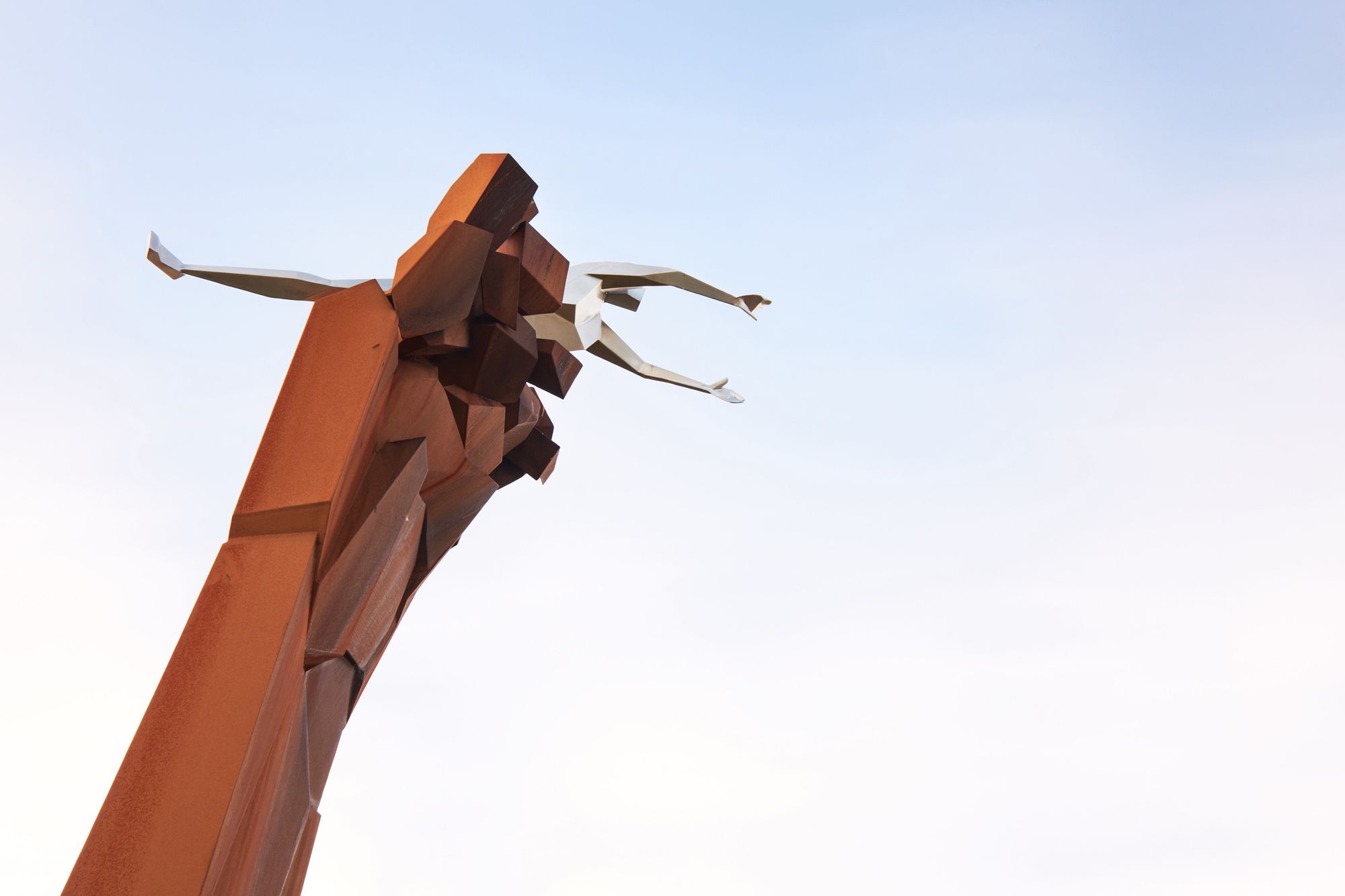 Over a three-month concept phase, the artist developed a creative approach based on three steel figures engaged in non-specific sporting actions, such as running and jumping. Each figure interacts with one of the three towering steel pillars, symbolically shattering them. Corten steel and aluminium reflect the raw, enduring strength. Artwork fabrication took four months, followed by a three-day installation at the site.